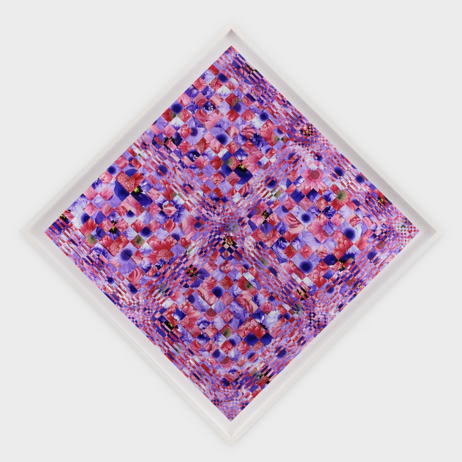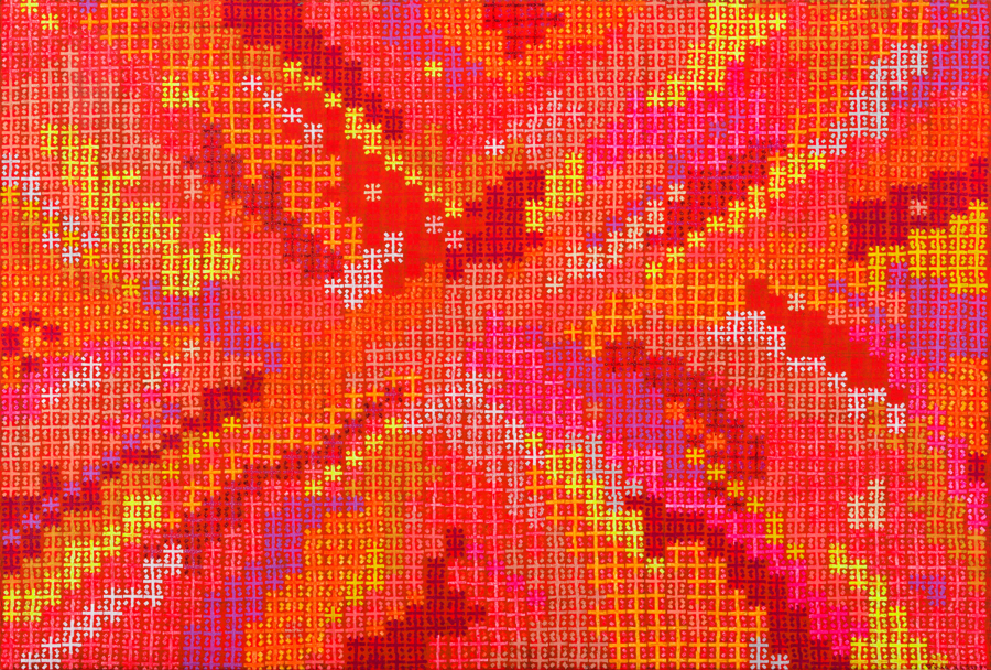 本次展览特别呈现上海艺术家丁乙的一件重要作品。丁乙是中国抽象艺术的开创者之一,他运用已成为个人特色的“十”字符号为核心,挑战传统的艺术实践。在《十示2006-3》(2006年)中,“十”字符号和格纹图案相互融合,充分彰显艺术家对节奏与结构的深度探索,营造出富有张力的表面与空间的动态对话。“十”字不仅是一种形式语言,也是对生活经历的反映:它是上海城市化进程的视觉回响,是对艺术家早年在印刷厂工作时的彩印技术的致敬,也是一场用耐心和专注力浇筑的冥想练习。